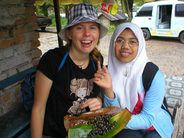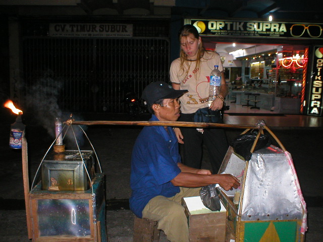 Putu, a well known Indonesian cake. Joanne wanted her photo taken with it. P1100579.JPG