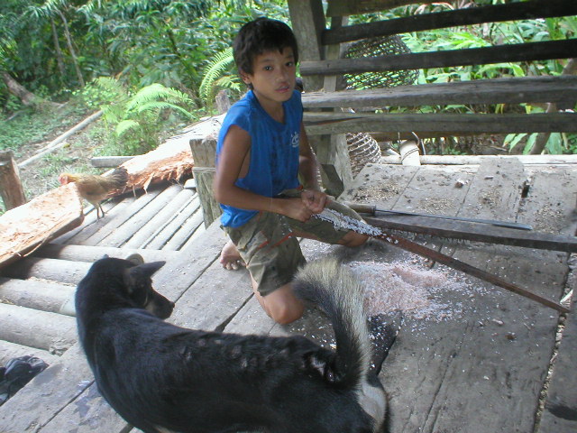 Sagu comes from a tree, here you can see the boy grating part of it. They cook the sagu in many ways.