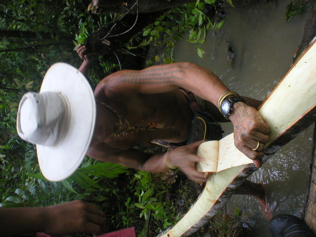 After they have the stretch of bark, they lay it on wood and beat it soft with another piece of wood.